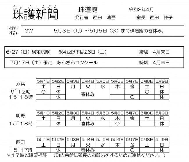 珠道館の春休み(GW休み)になります。