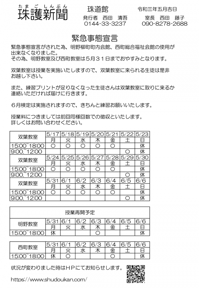 緊急事態宣言が解除されるまで明野教室と西町教室はお休みとなります。